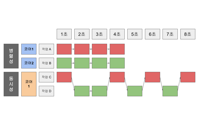 - 병렬성 : 멀티코어 환경에서 각 작업이 병렬로 실행